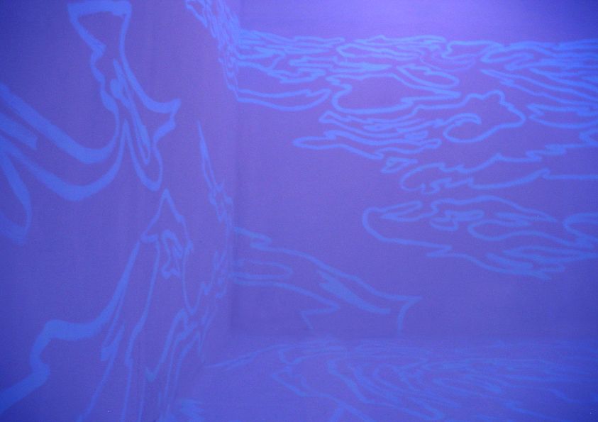Implosion is an installation, in which show structures of the water surface on the walls and the floor, by means of fluorescent colours. For four minutes the room is shown in black light and than for one minute in artificial light. During the time of black light the drawings are visible and the murmur of the sea is heard, but when artificial light enlightens the room, everything becomes quiet and the drawings on the walls and floor disappear.